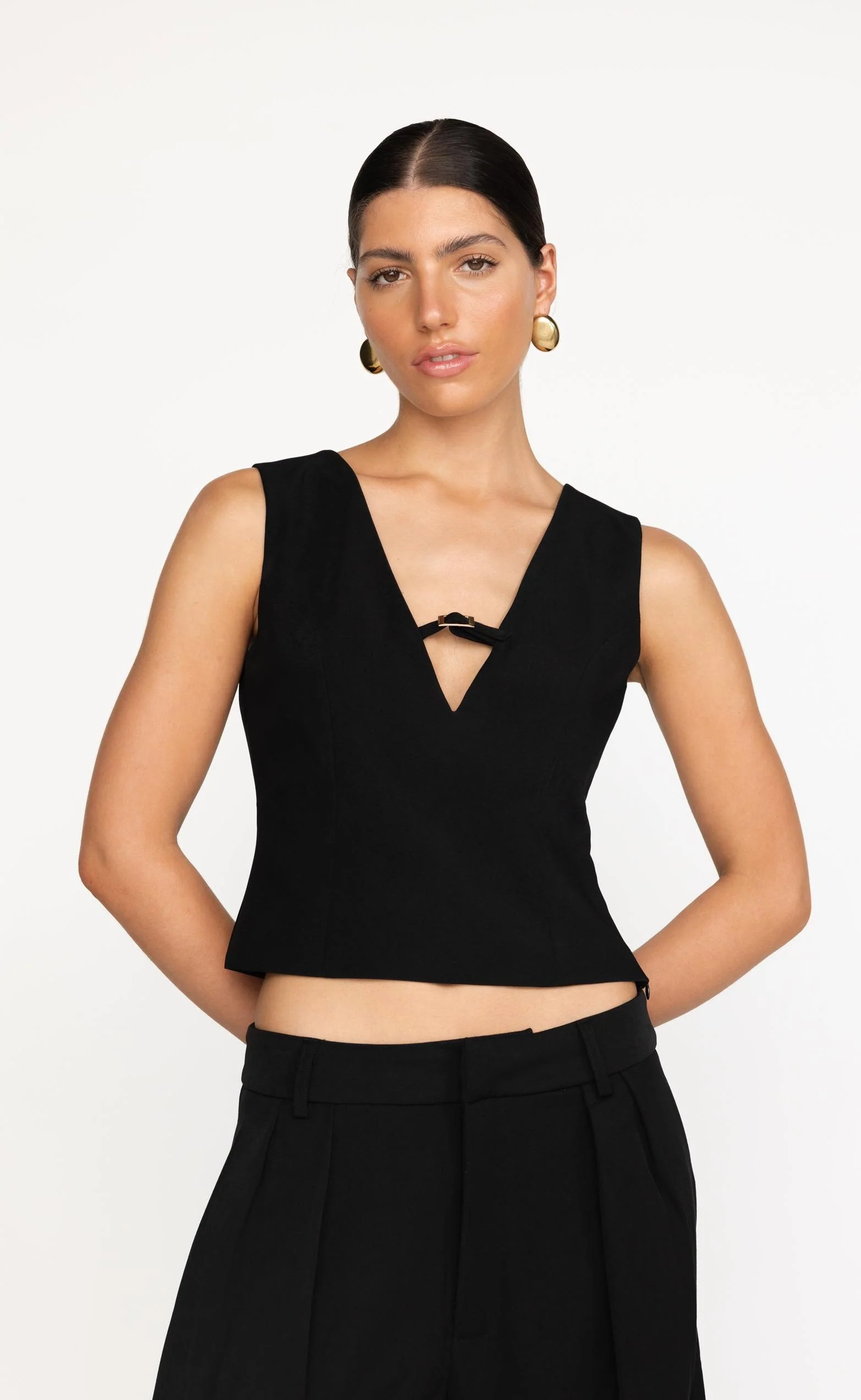 The Cressida Top combines elegance with modern style, featuring a unique belt-look bust detail adorned with gold accents. Designed with a fitted bodice and a flattering V-neckline, this top enhances the silhouette while adding a touch of sophistication. Perfect for dressing up or down, it's a versatile piece with timeless appeal.