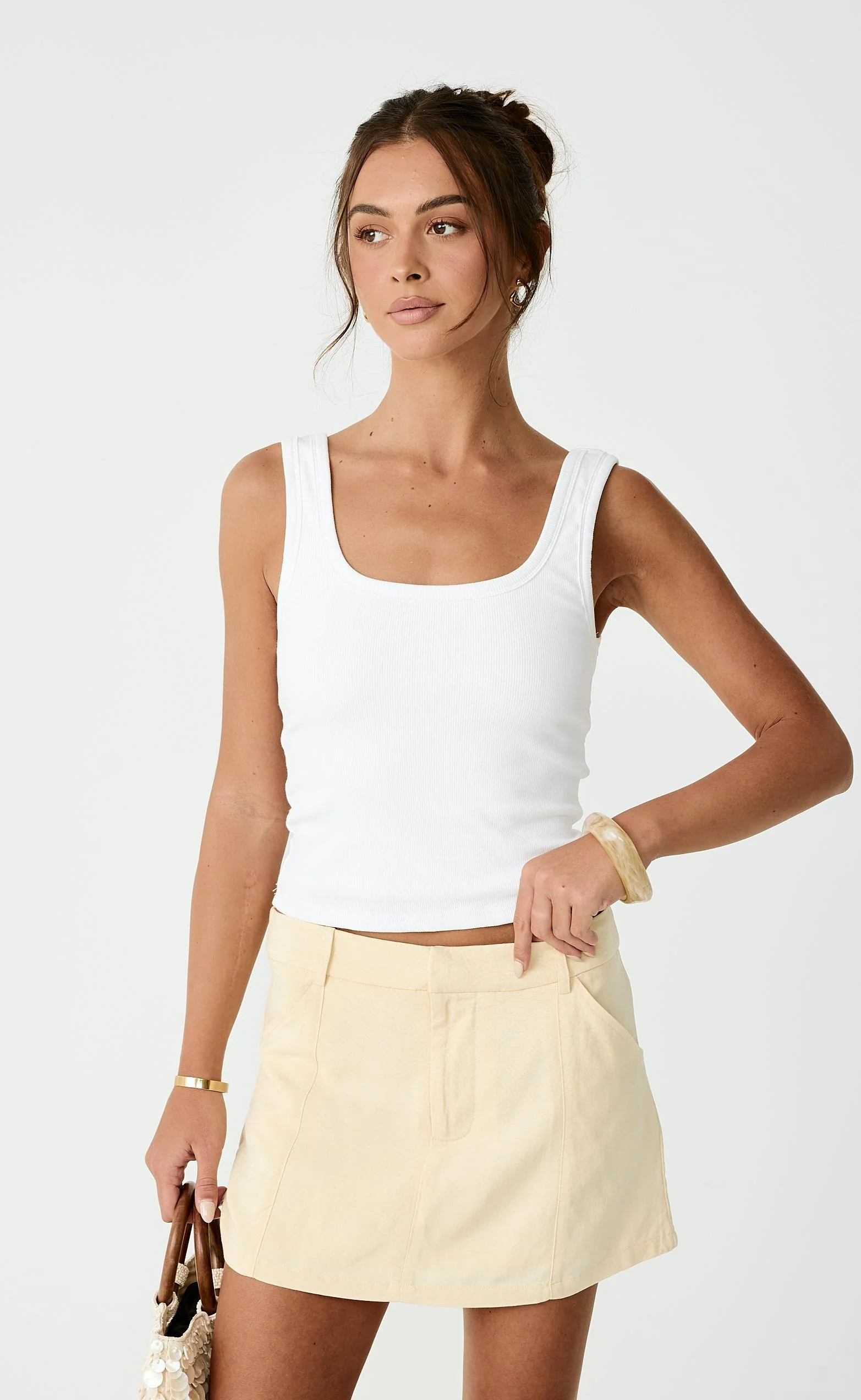 The Deston Mini Skirt is a structured, tailored mini with clean lines, front pocket detail, and a polished finish.