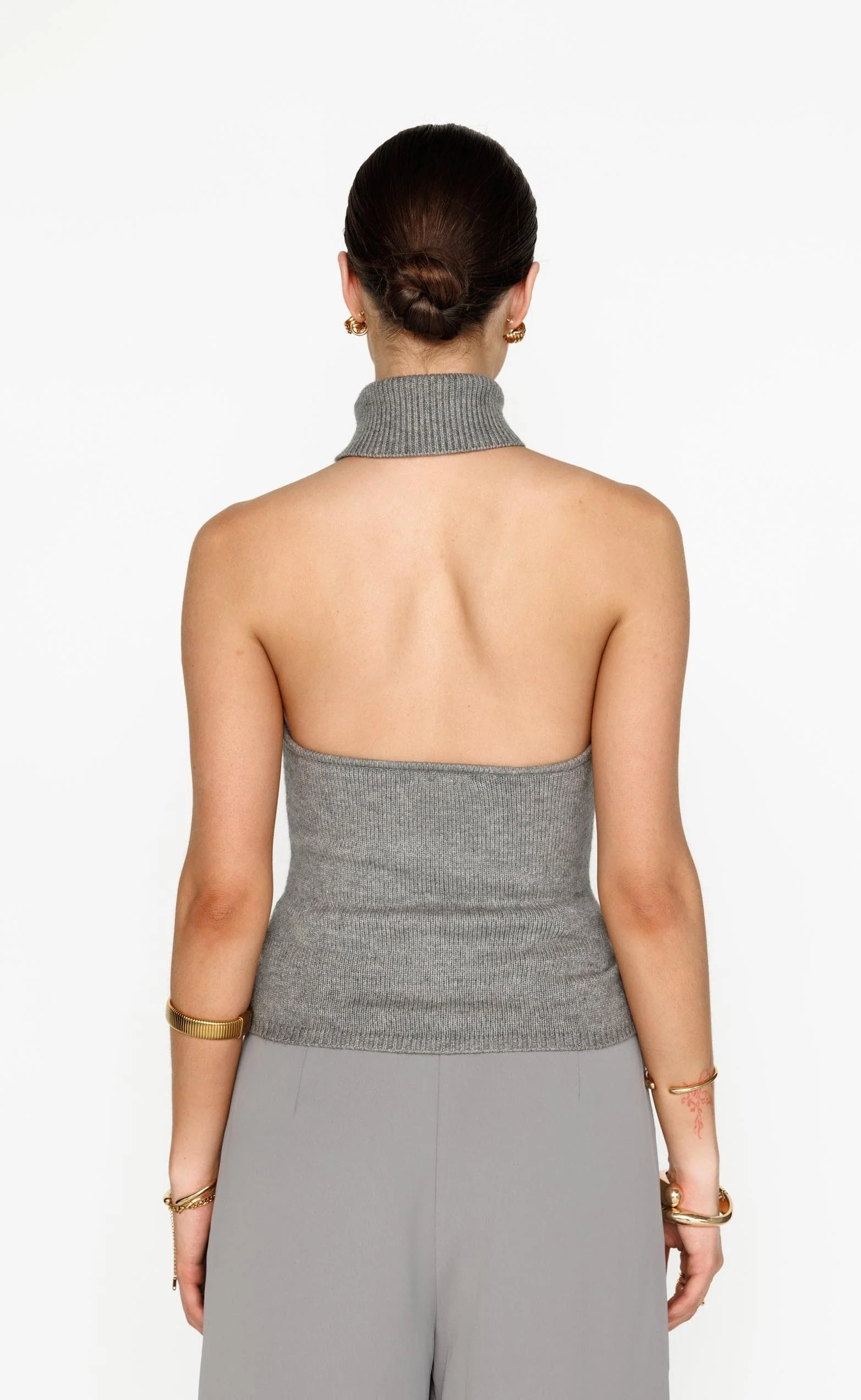 Introducing the Ninette Top: a sleeveless, full-length top crafted from knit fabrication with a ribbed turtle neck. This bodycon design features a low back and offers stretch for comfort and style, making it a versatile piece suitable for various occasions.