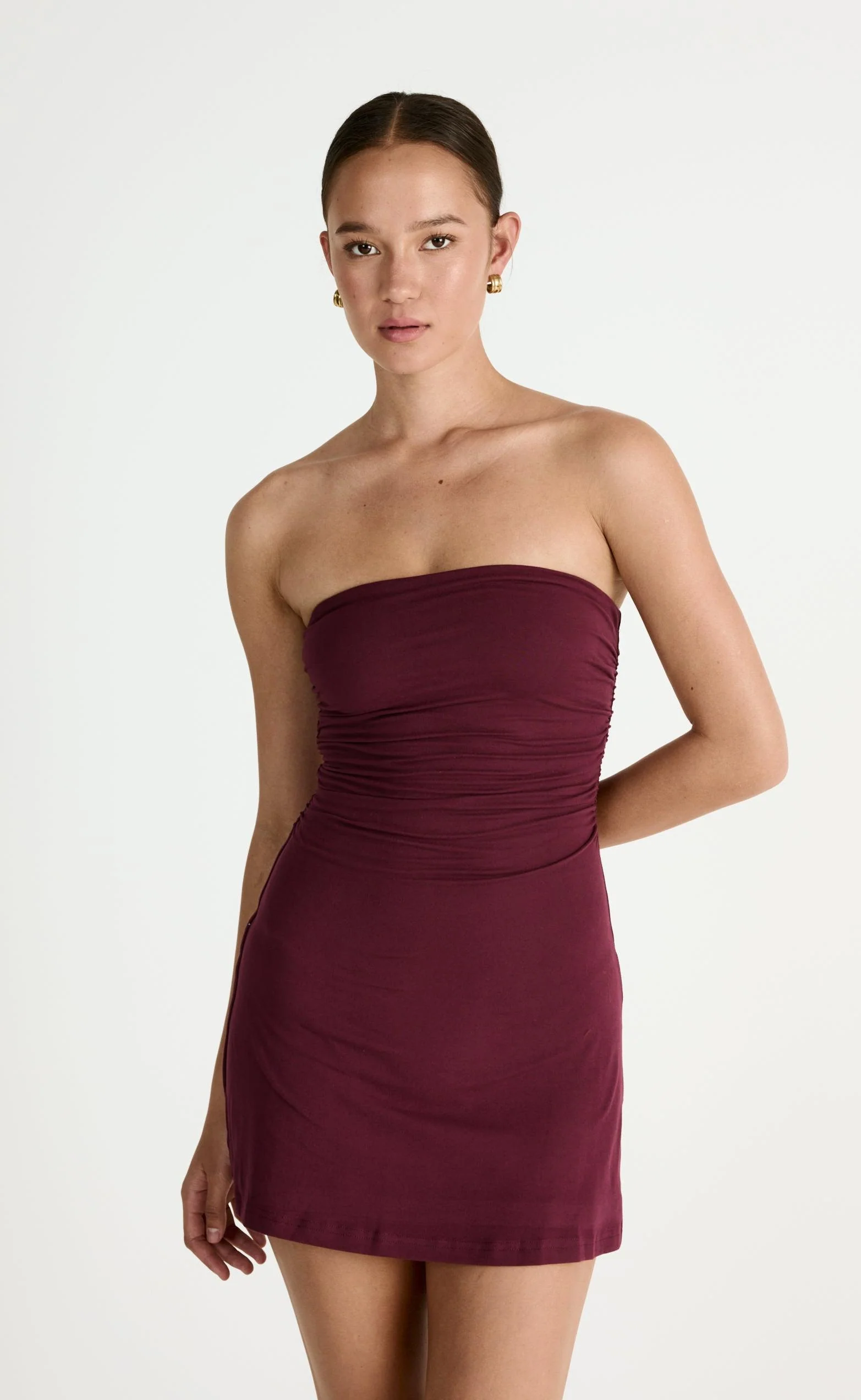 Introducing the Sarie mini dress, a breathtaking blend of style and comfort. This strapless design, made from buttery soft jersey fabric, features grip tape around the bust for a secure and confident fit, allowing you to effortlessly showcase its flattering bodycon silhouette. The pull-on style adds convenience, while the flowing skirt exudes sophistication. Fully lined for practicality and elegance, this dress is an ideal choice for any special occasion.
