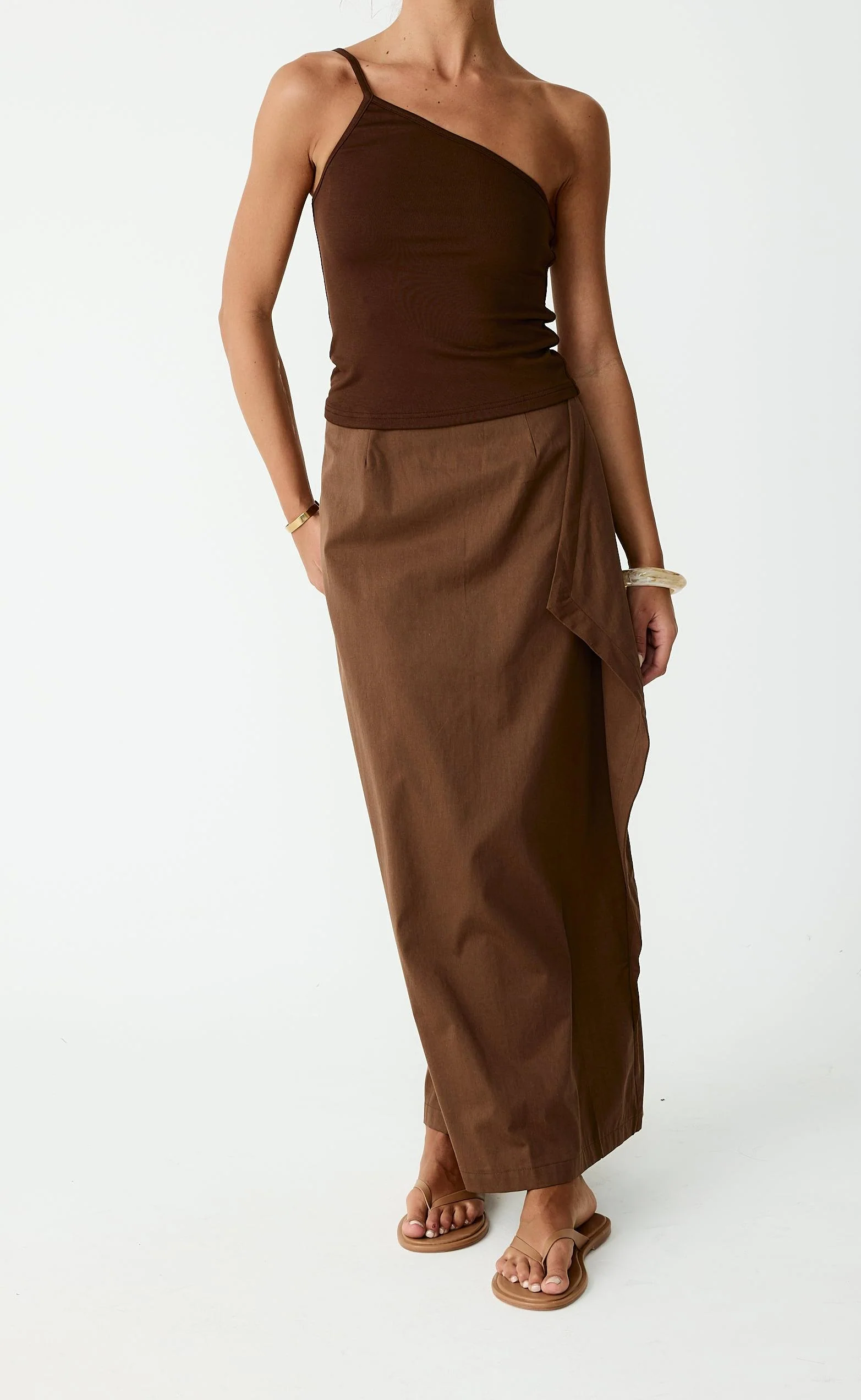 The Sizzling Maxi Skirt is a draped, asymmetric style with a sleek, modern edge.